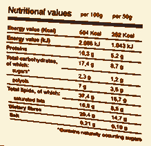Natural Almond with very low glicemic index, cacao butter 25,8%, fibre (inulină) 24,9%, milk integral 14,9%, cacao mass 12,9%, low fat milk10,9%, sweetener (maltitol) 9,9%, emulsionant (soy lecitin), sweetener (steviol glicozide- extract from STEVIA rebaudiana Bertoni), natural aroma